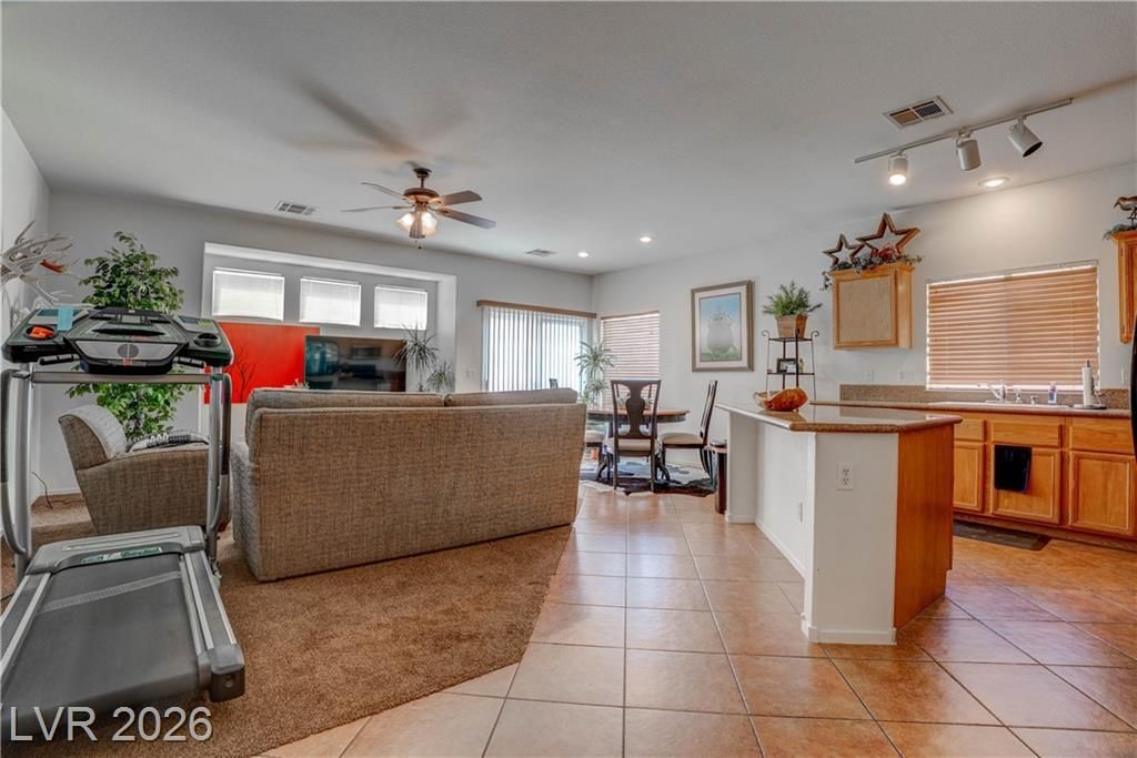Welcome to this charming single-story home featuring 3 bedrooms and 2 bathrooms, thoughtfully designed with an open-concept layout that seamlessly connects the main living area to the kitchen?perfect for both everyday living and entertaining. The kitchen offers a sizeable island, granite countertops, oak-finished cabinetry, and a blend of recessed and track lighting for a warm, inviting feel. The private primary suite is set apart from the secondary bedrooms, providing a comfortable retreat, while the additional bedrooms are conveniently located down a separate hall. Step outside to a spacious backyard complete with low-maintenance rock landscaping?ideal as-is or ready to be transformed into your own personalized outdoor oasis. Enjoy added privacy with no immediate neighbor on the east side that is separated by a walking trail that leads directly to the well maintained community park.