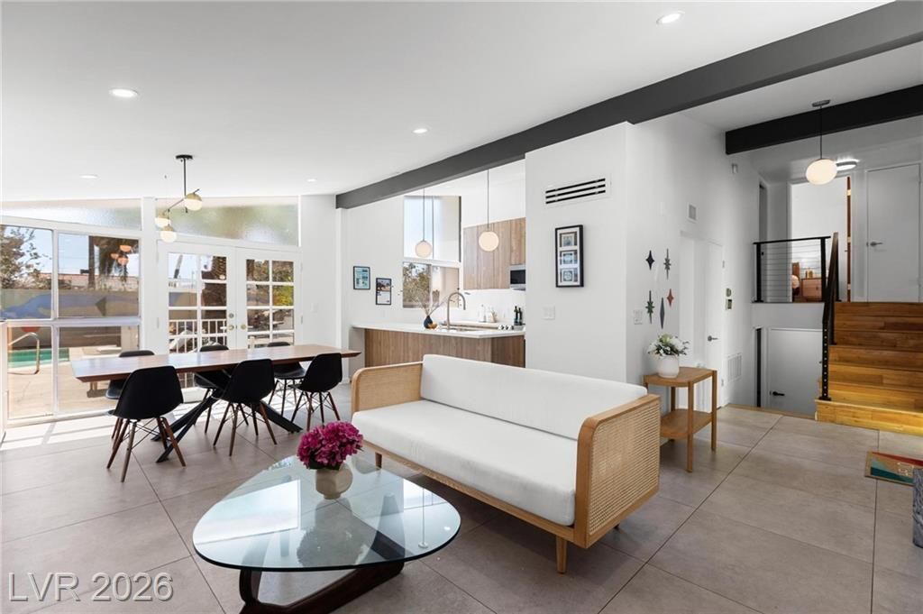 Furnished Mid-Century Modern home in the highly desirable historic neighborhood of Paradise Palms on a corner lot. This iconic & much sought after Krisel tri-level plan 5A was completely renovated in 2022 and refreshed in 2026. Has solar, water softener & reverse osmosis. Vaulted ceilings, floor to ceiling windows, open concept kitchen, living room (with wood-burning fireplace) & dining on main floor with patio door to pool. Bottom level has designated separate laundry room, large den / family room with 1/2 bath & an additional downstairs suite WITH PRIVATE ENTRANCE, kitchenette & full bathroom. Primary room with ensuite bath. Original breeze blocks, clerestory windows throughout & an oasis of a backyard with pool, outdoor shower, outdoor dining & lounge space. Includes pool maintenance and landscaping.