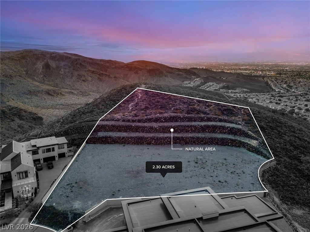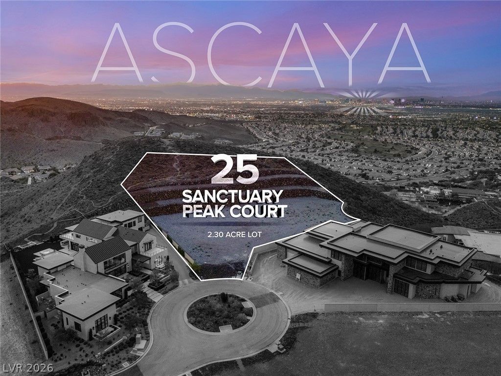 Commanding a premier position within Ascaya, this exceptional 2.30-acre cul-de-sac corner homesite at 25 Sanctuary Peak offers a rare opportunity to create a signature desert estate. Elevated above the valley, it captures sweeping views of the Las Vegas Strip, Red Rock Canyon, Sunrise Mountain, and shimmering city lights. Privately situated with space for a grand gated approach, this expansive parcel blends seclusion with convenience near the guard gate and community amenities. Development-ready with utilities in place and approved for a single- or two-story residence. Ascaya is renowned for its striking desert contemporary architecture, signature stone walls, and elevated lifestyle, featuring a five-star clubhouse, resort-style pool, fitness center, sports courts, park, and trails?all within a guard-gated community with 24/7 security. Located in Henderson, one of the safest cities in the U.S.