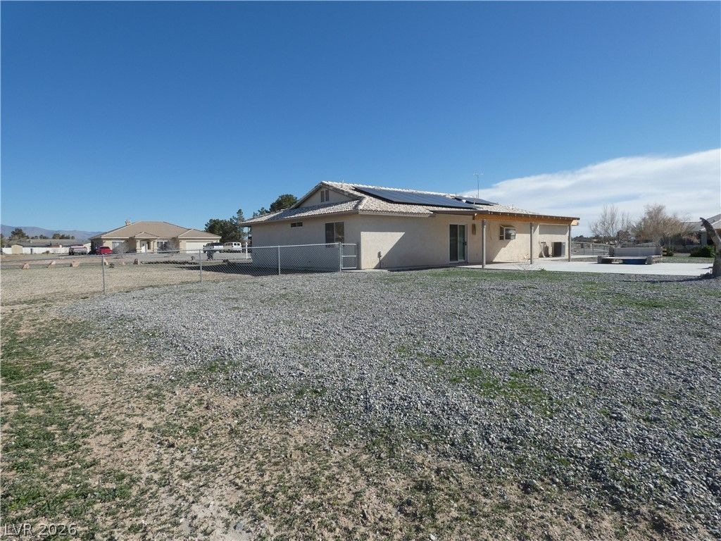 This 1.14-acre RE-1 property is a move-in ready stronghold, now strategically priced at 369,900. In an era of rising costs, this home offers owned solar, private water, and absolute land choice. UTILITY SOVEREIGNTY: 100 percent owned 21-module solar system and private well/septic. Eliminate energy usage fees and water bills. Supported by a PEX manifold, soft water loop, and climate-secured well house. CLIMATE ENGINEERED: New Andersen high-efficiency front and patio doors. Deep front overhangs and expansive back patio covers shield against the desert sun. INTERIOR AND STORAGE: Open floor plan, new stainless appliances, and wood-style flooring. Primary Suite and one guest room have comfortable carpet. Every bedroom has customized closets. Primary Suite includes a large walk-in plus a separate, customized built-in unit. Two additional hallway storage closets. LAND: Fenced 1.14-acre parcel, 2-car garage, workshop, and RV gate. OWN YOUR RESOURCES. OWN YOUR LAND. OWN YOUR CHOICE.