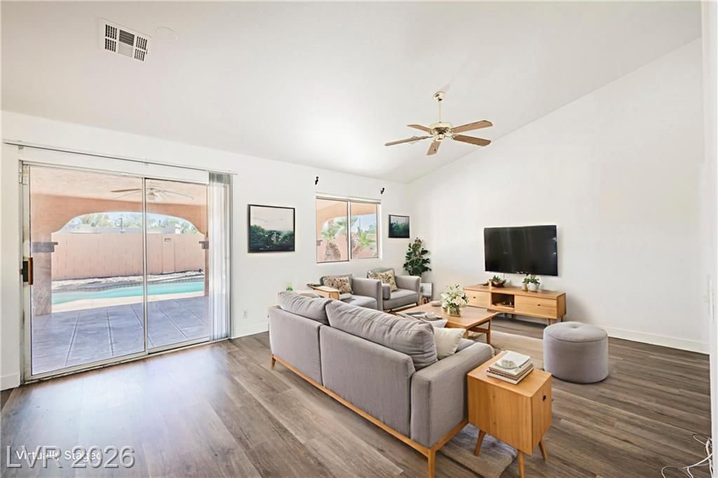 Energy efficient corner-lot, single story home.This 3-bedroom, 2-bath residence features a low-maintenance desert landscape, a spacious 3-car garage, and a beautifully refreshed interior with freshly painted walls and kitchen cabinets. Step inside to soaring vaulted ceilings, abundant natural light, a modern color palette, with laminate wood flooring throughout. The expansive living and dining area flows effortlessly into a bright family room, which opens to the kitchen and backyard through sliding glass doors, creating the perfect setup for entertaining. The kitchen shines with freshly painted cabinetry, granite countertops and stainless steel appliances. Out back, enjoy a private retreat with a covered patio featuring tiled flooring, a built-in BBQ, and a shimmering pool perfect for cooling off on warm days. Conveniently located with easy freeway access and close to shopping, dining, and everyday essentials, this home blends comfort, style, and functionality.