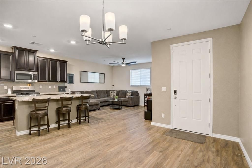 Assumable FHA @3.25% rate . Ask for Details ! INCREDIBLE! Almost new and move-in ready! This stunning townhouse in the gated Morning Ridge community combines modern style with comfort and function. Enjoy LVVP flooring throughout the main living areas and an open, light-filled floor plan centered around a spacious kitchen with a large white granite island, espresso cabinets, tile backsplash, and stainless steel appliances. As an end unit, you'll appreciate extra privacy with neighbors on only one side. Upstairs, a huge loft offers the perfect flex space for a home office or media area. The bedrooms are generously sized, and the primary suite is truly abundant?featuring a large walk-in closet, and a spa-like bathroom with a separate tub and walk-in shower. Finished with Santa Fe texture throughout and equipped with fire sprinklers for peace of mind and Insurance savings , this stylish and secure home is the total package!
